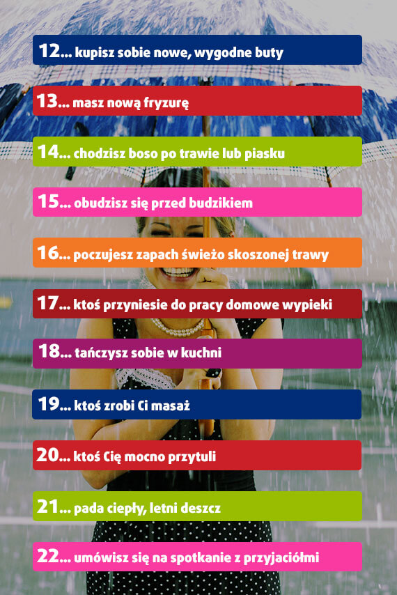 Nie wiesz od czego zacząć? Specjalnie dla Ciebie przygotowaliśmy listę 80 drobiazgów, które mogą sprawić, że Twoje życie stanie się pełne szczęścia i radości. Popraw swoje samopoczucie i nauczy się odczuwać radość, gdy…